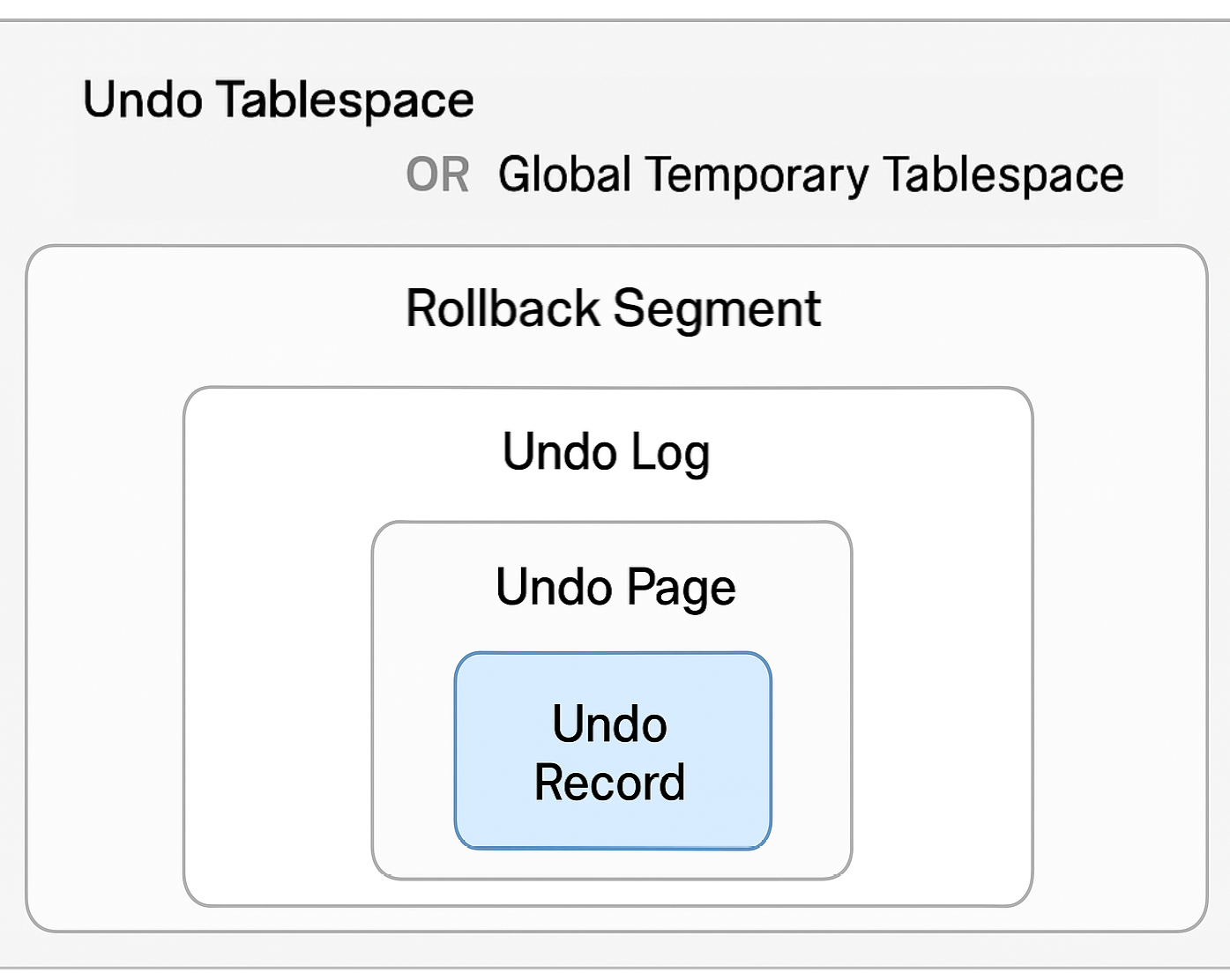 언두 로그는 롤백 세그먼트 안에 포함된 언두 로그 세그먼트 내에 존재하며, 롤백 세그먼트는 언두 테이블스페이스와 글로벌 임시 테이블스페이스 내에 존재합니다.